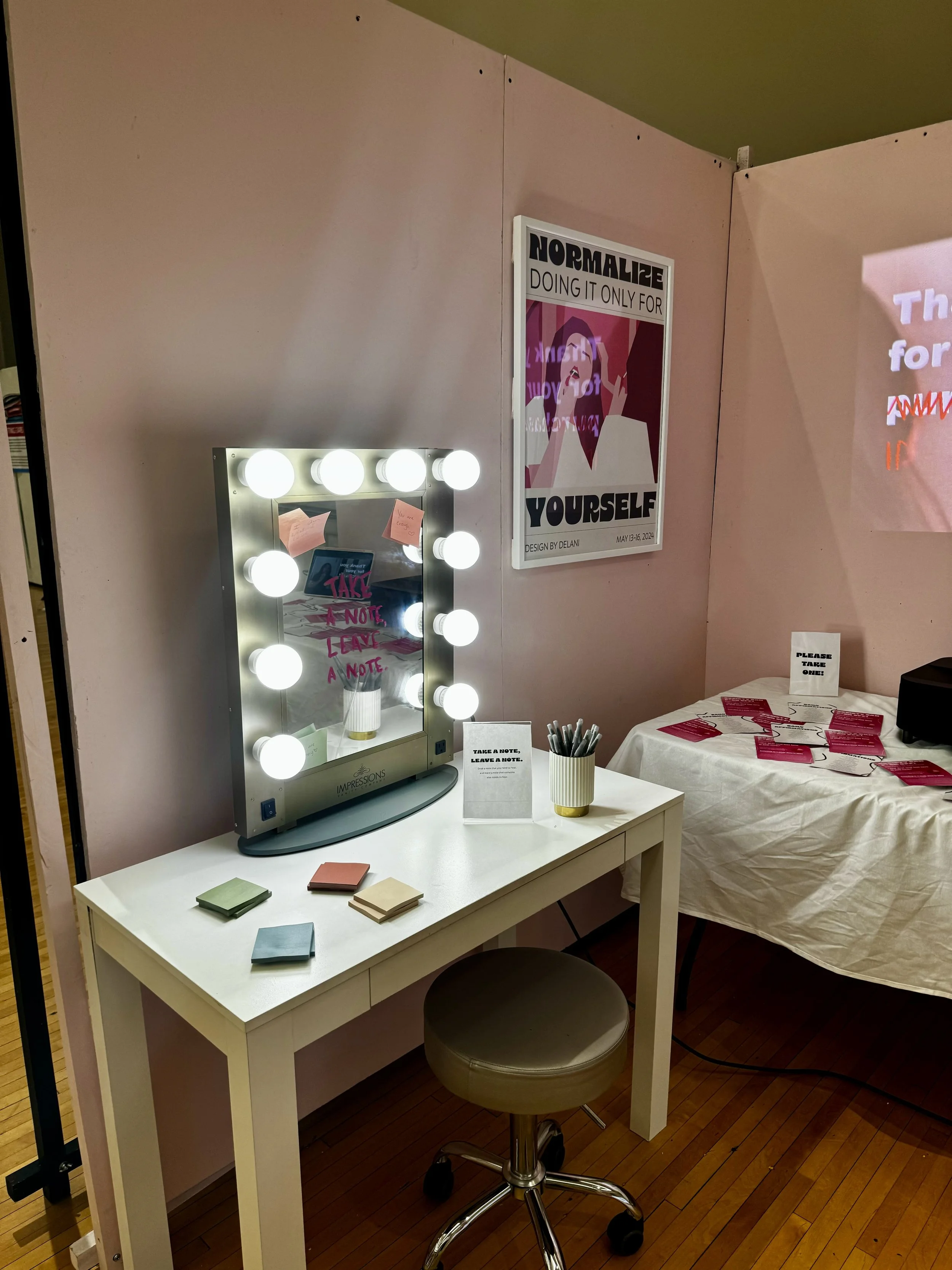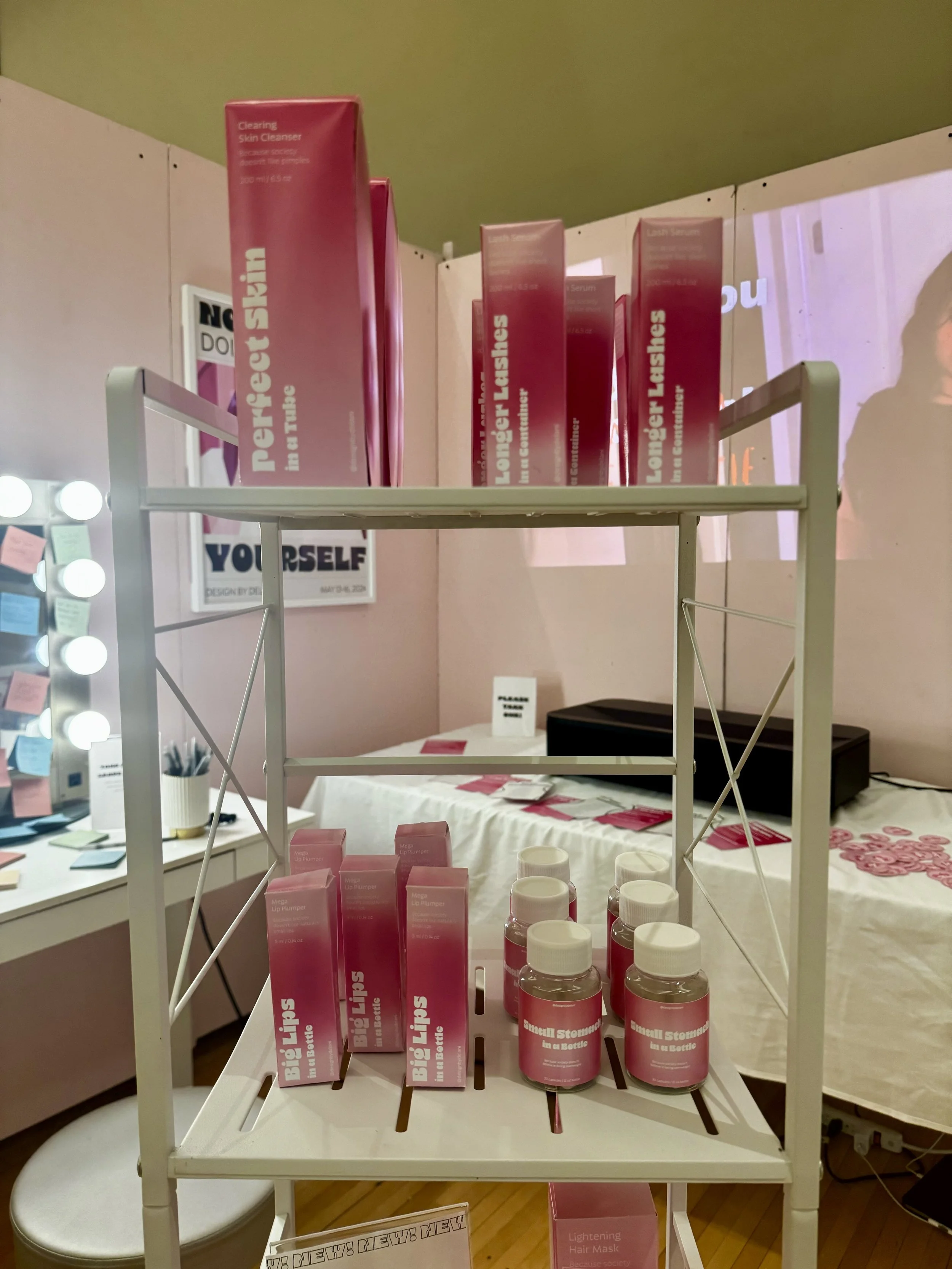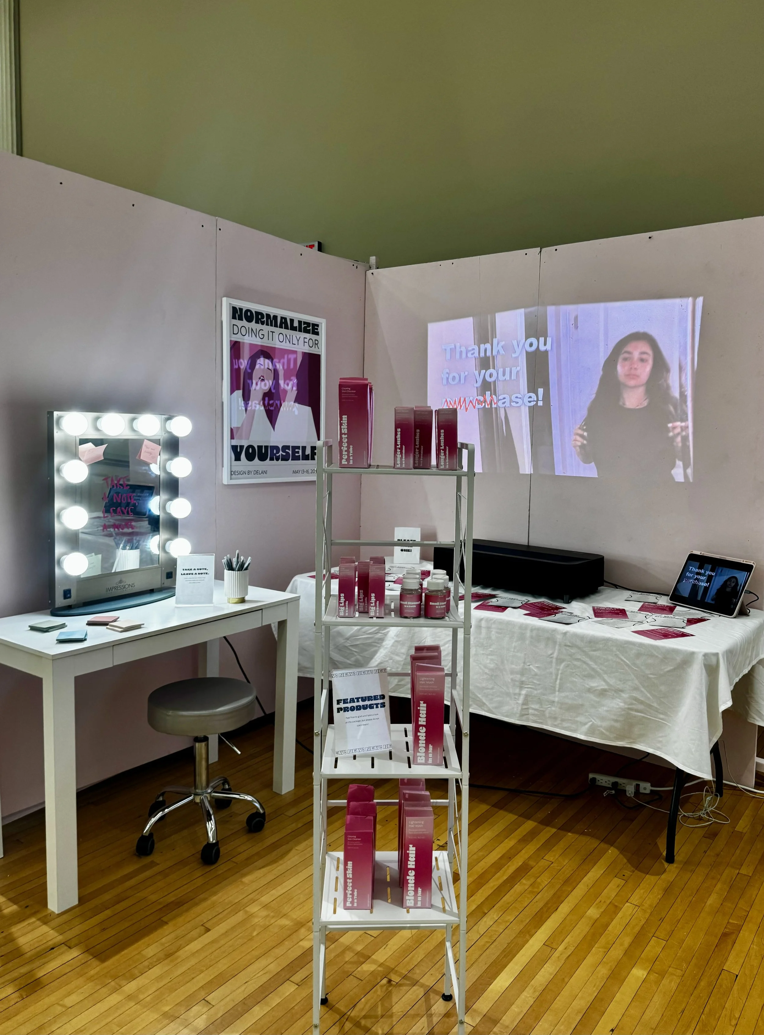 The concept of my capstone visually displays the unrealistic beauty standards society enforces for women. I designed the layout to resemble a beauty store, containing a product shelf, a vanity, and a video that you would typically see behind checkout counters.